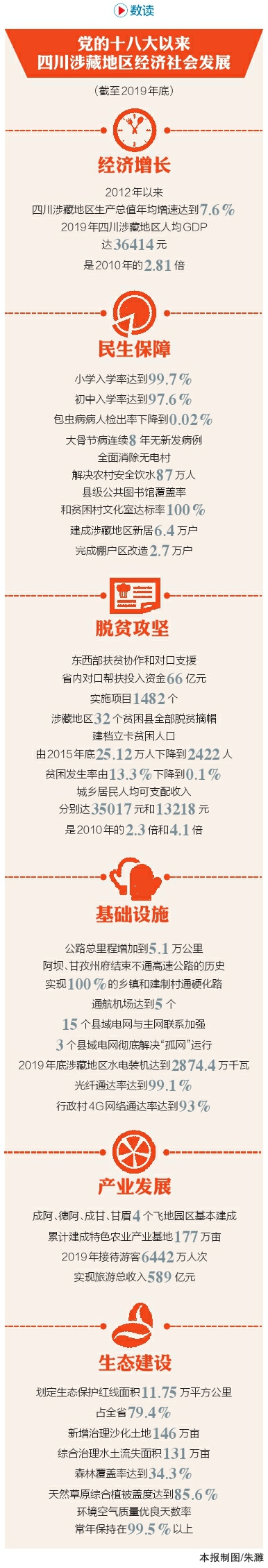 省委涉藏辦相關(guān)負(fù)責(zé)人告訴記者,近年來四川省涉藏地區(qū)加快發(fā)展特色優(yōu)勢產(chǎn)業(yè),推動全域旅游、高原農(nóng)牧業(yè)、清潔能源、民族手工藝等提質(zhì)增效。依托大熊貓、大九寨、大香格里拉、大草原等特色資源,涉藏地區(qū)大力發(fā)展全域旅游,“凈土阿壩”“圣潔甘孜”“大涼山”品牌影響力不斷提升,阿壩州、甘孜州成功創(chuàng)建首批國家級全域旅游示范區(qū),2019年接待游客6442萬人次、實(shí)現(xiàn)旅游總收入589億元。涉藏地區(qū)重點(diǎn)發(fā)展高原牦牛、特色果蔬、釀酒葡萄、優(yōu)質(zhì)青稞、道地中藏羌藥材、野生食用菌等產(chǎn)業(yè),基本建成成阿、德阿、成甘、甘眉4個飛地園區(qū);大力推進(jìn)清潔能源建設(shè),水電裝機(jī)容量達(dá)到2875.6萬千瓦。截至2019年底,四川涉藏地區(qū)人均GDP達(dá)到36414元,是2010年的2.81倍;城鄉(xiāng)居民人均可支配收入分別達(dá)到35017元、13218元,接近全省平均水平,向2020年底實(shí)現(xiàn)全面同步小康邁出了堅(jiān)實(shí)一步。
