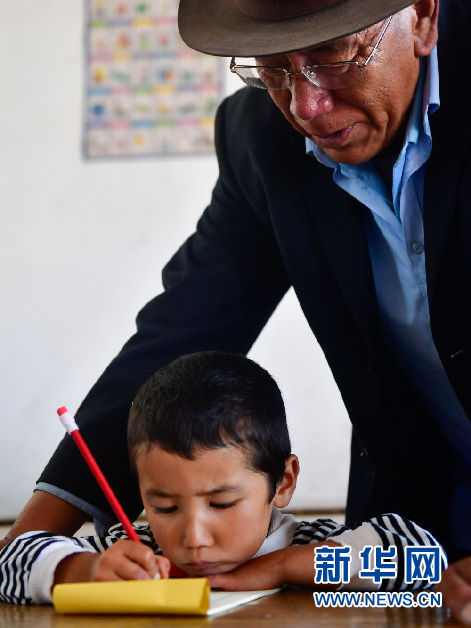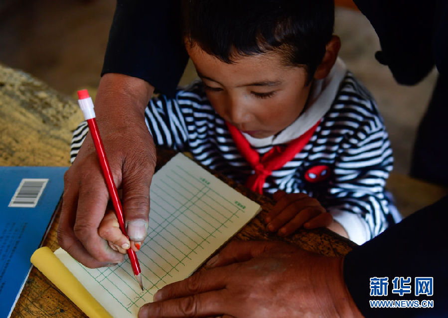 8月31日,在來塘村學(xué)校,完么仁增老師在指導(dǎo)一年級(jí)學(xué)生馬文輝學(xué)習(xí)。新華社記者 張龍 攝