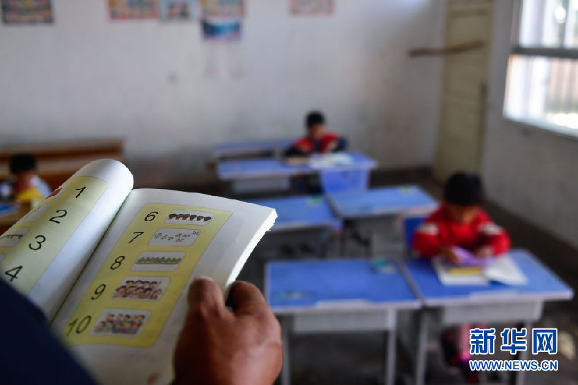 8月31日,在來塘村學(xué)校,完么仁增老師在指導(dǎo)一年級(jí)學(xué)生馬秀梅學(xué)習(xí)。新華社記者 張龍 攝