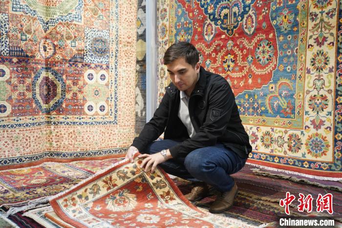 圖為來(lái)自土庫(kù)曼斯坦的留學(xué)生Resul欣賞地毯。文思睿 攝