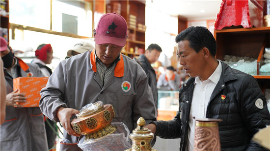 桑旦蘭周向記者介紹甘達(dá)村家庭小作坊生產(chǎn)的產(chǎn)品。陳安陽 攝