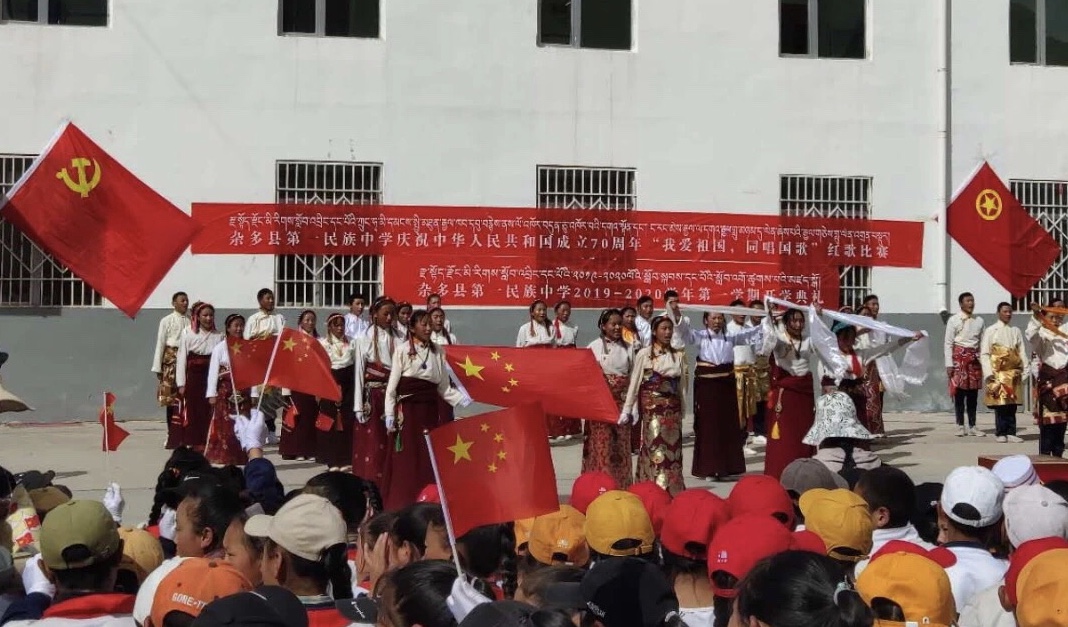 雜多縣第一民族中學(xué)的學(xué)生正在參加“慶祝中華人民共和國成立70周年”歌唱比賽活動(dòng)。 本文受訪者供圖