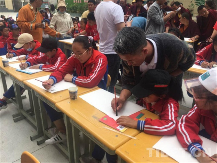 “右手拿筆,拇指和食指握住距離筆尖3厘米左右的位置,掌心中空書寫,對(duì),就是這樣?!眮?lái)自四川省藏文學(xué)校、西南民族大學(xué)、康巴文化研究院、甘孜日?qǐng)?bào)社、甘孜民族中學(xué)、理塘?xí)覅f(xié)會(huì)等單位的14位書法家在縣城關(guān)小學(xué)為近100名小學(xué)生現(xiàn)場(chǎng)傳授和指導(dǎo)藏文書法書寫技巧和心得。
