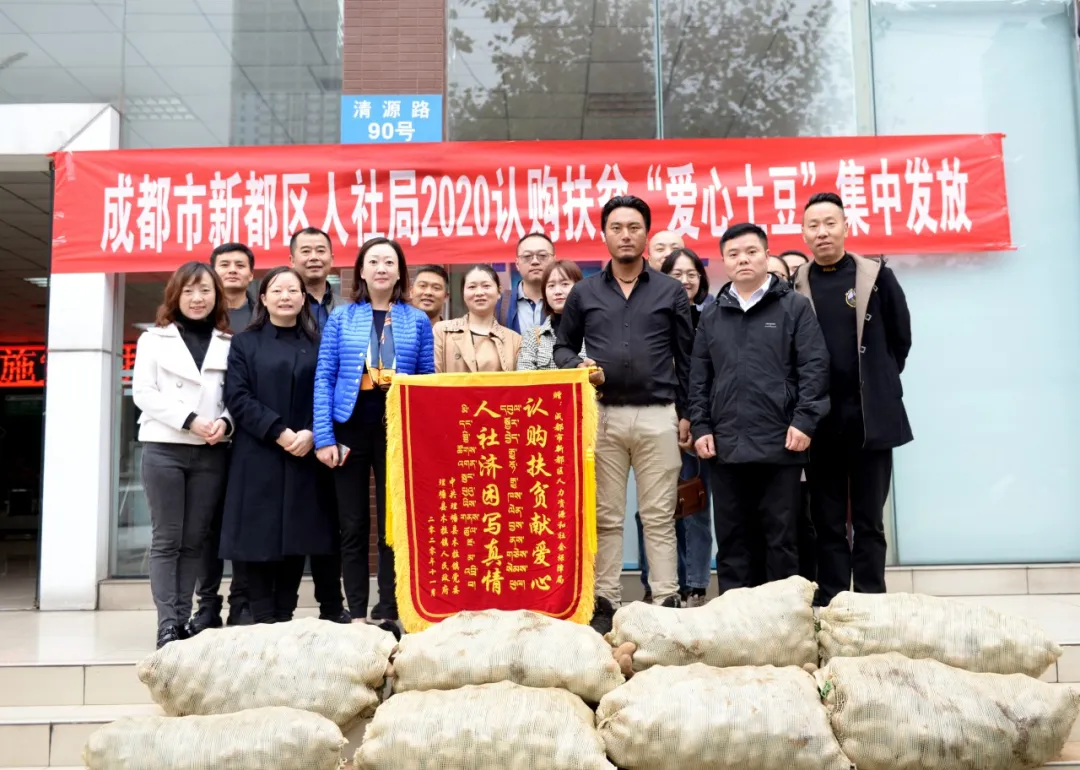 “感謝你們幫助認(rèn)購3萬余斤土豆……扎西德勒!”11月6日上午8點(diǎn)36分,來自理塘縣木拉鎮(zhèn)卡下村的“愛心土豆”車隊(duì)剛在新都區(qū)人社局停車場(chǎng)停穩(wěn),村長降央吉村一個(gè)躍步下車,為等候多時(shí)的人社局同志送上“認(rèn)購扶貧獻(xiàn)愛心、人社濟(jì)困寫真情”的錦旗。