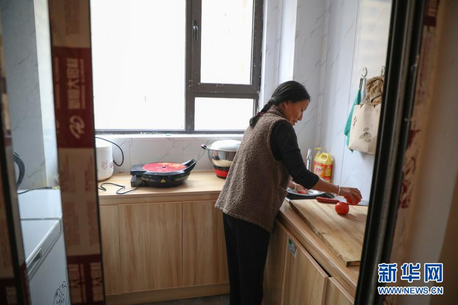 12月2日,在舟曲縣曲告納鎮(zhèn)田園生態(tài)小區(qū)易地扶貧搬遷集中安置點,曲告納鎮(zhèn)茶坪村扎尕組村民在臨時安置的房屋內(nèi)做飯。新華社記者 馬希平 攝