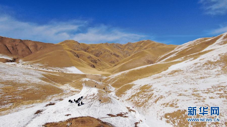 在青海省祁連縣,一群牦牛在雪后活動(12月7日攝,無人機照片)。新華社記者 張宏祥 攝