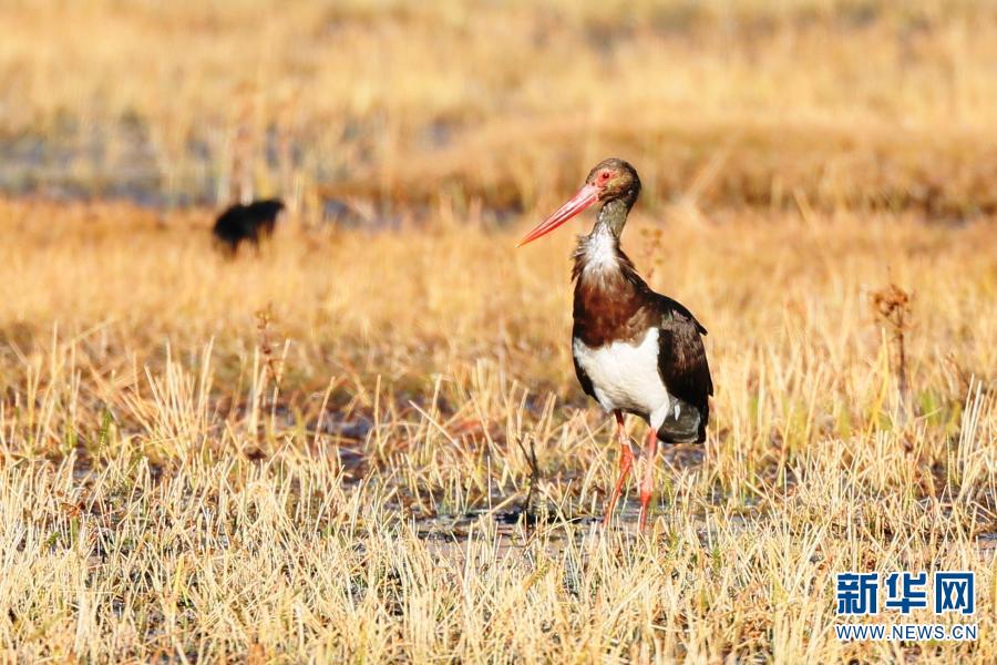這是2019年10月31日在云南省香格里拉市納帕海國際重要濕地拍攝的黑鸛。新華社 陳志明 攝