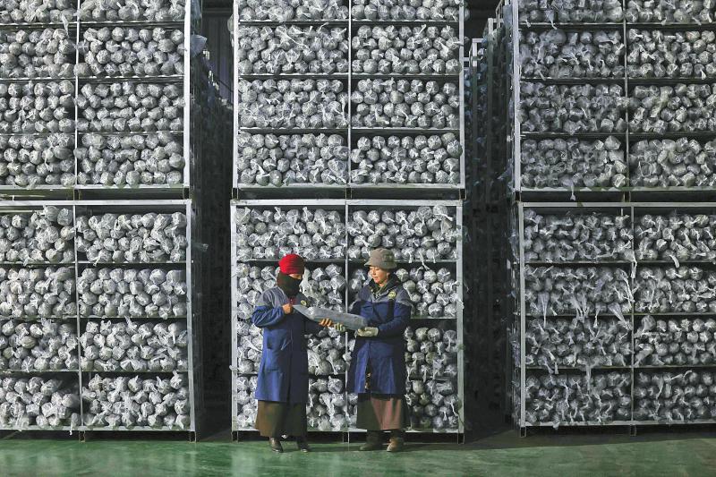 1月4日,松茸產(chǎn)業(yè)園的管理人員在倉庫里整理即將發(fā)放給當?shù)胤N植戶的滑子菇菌包。尹鋼 攝