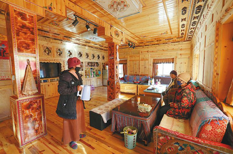 八角樓鄉(xiāng)帕姆林村的白馬翁姆(左)是產(chǎn)業(yè)園的接種工,每月收入4000元。1月5日,她在新家客廳接待外地來的客人。尹鋼 攝