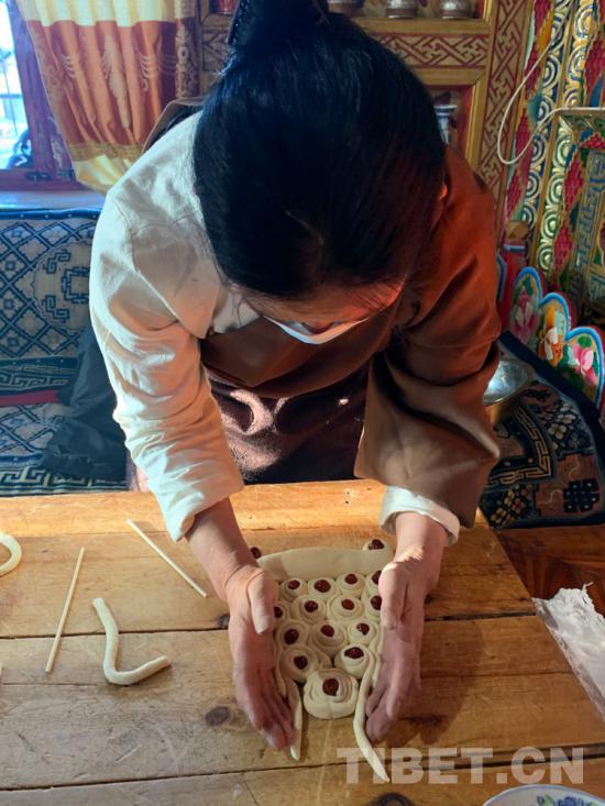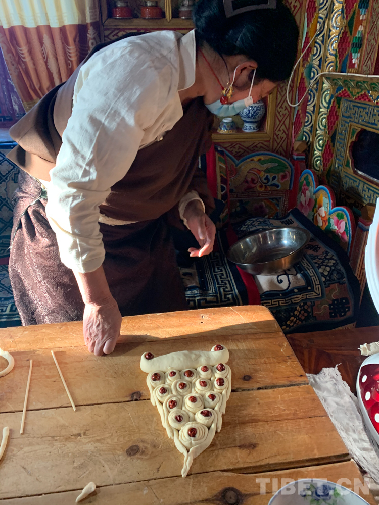 在理塘,“拿朵”是新年必不可少的傳統(tǒng)美食,這種以面粉為主要原料制作的酥油果子,因脆甜好看而備受男女老少的喜愛。