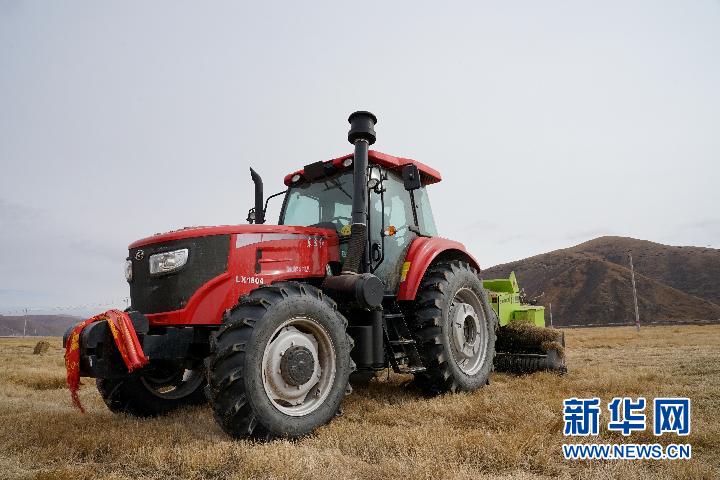 在青海省果洛藏族自治州甘德縣江千鄉(xiāng),牧民在飼草基地駕駛打捆機(jī)作業(yè)(2020年11月3日攝)。新華社記者 陳凱 攝