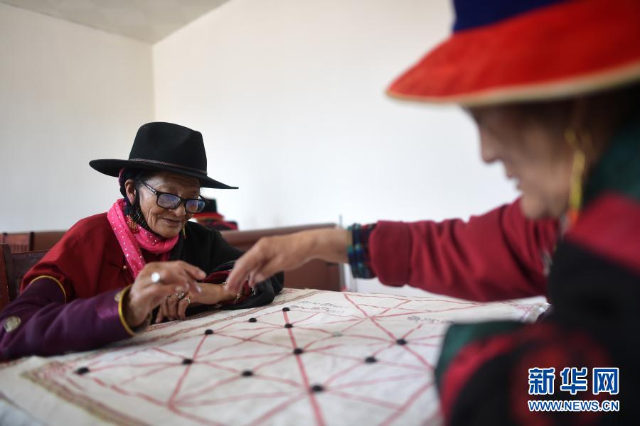 3月14日,在治多縣幸福敬老院棋牌室內,來自治多縣索加鄉(xiāng)的75歲老人青美(左)和同伴在下藏棋。新華社記者 張宏祥 攝