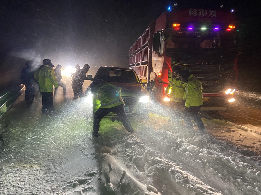 在這次緩堵保暢工作中,瑪多縣公安局交警大隊副隊長李西帶領(lǐng)大隊所有民警、輔警趕到現(xiàn)場處理滯留車輛。由于這一路段為長大坡道、急彎路段,加之大風(fēng)將雪吹至路面,導(dǎo)致有60余輛車滯留。當(dāng)時最低氣溫為零下10℃,在海拔高度4542米的惡劣環(huán)境下,工作人員用凍僵的雙手為被困群眾保駕護(hù)航。