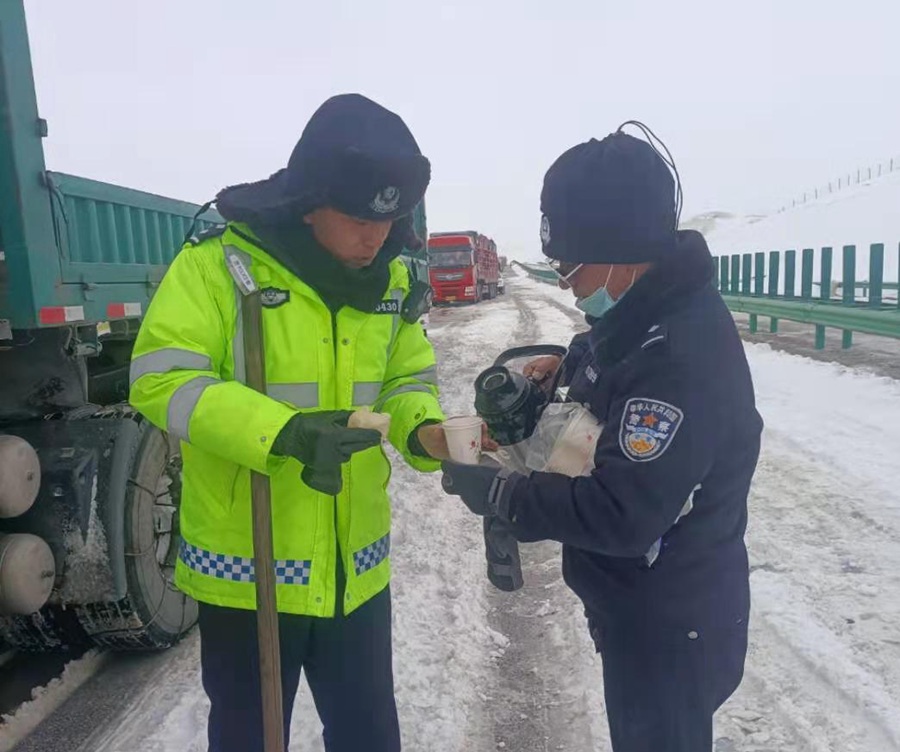 李西和同事們紛紛拿起鐵鍬將積雪鏟至道路兩邊,迅速開辟出一條臨時車道,讓車輛緩慢通行,這時他們已經(jīng)連續(xù)奮戰(zhàn)7個多小時。民警吃的是溫水泡的方便面,渴了就喝冰涼的礦泉水,或者直接抓一把雪塞到嘴里。累的實在不行就隨便找個能擋風(fēng)的地方睡一會。有時候遇到堵車,有些司乘人員沒有帶食物,大家還把自己的口糧分給他們,他們只能挨著餓。