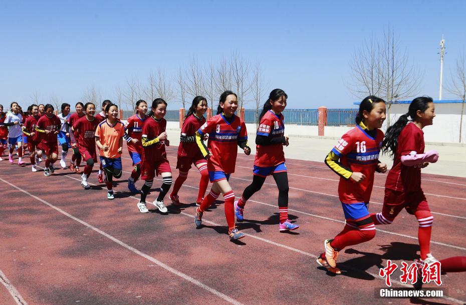 4月21日,青海省海南藏族自治州共和縣,青海湖民族寄宿制學(xué)校的足球場上,女子足球隊(duì)的隊(duì)員們正在進(jìn)行訓(xùn)練。該校的女子足球隊(duì)共有小學(xué)組、初中組隊(duì)員53人,皆為來自牧區(qū)的藏族女孩。中新社記者 馬銘言 攝