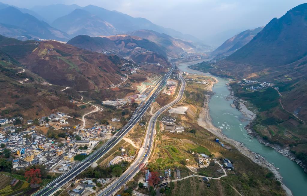 保瀘高速、美麗公路南延線(xiàn)與怒江(從左到右)。新華社記者 陳欣波 攝
