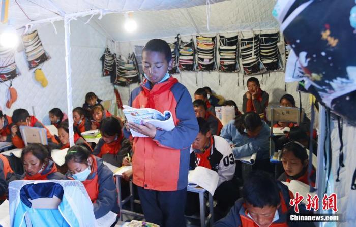 5月24日,瑪多縣民族寄宿制中學(xué)的學(xué)生在帳篷教室內(nèi)上課。當(dāng)日,青海省果洛藏族自治州瑪多縣學(xué)生復(fù)課。 中新社記者 馬銘言 攝