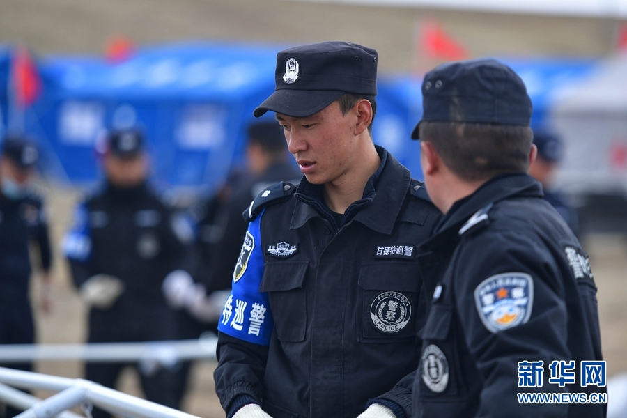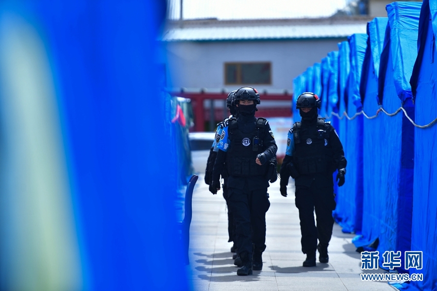 5月26日,果洛州公安局特警支隊的特警在瑪多縣縣政府廣場臨時安置點(diǎn)內(nèi)巡邏。