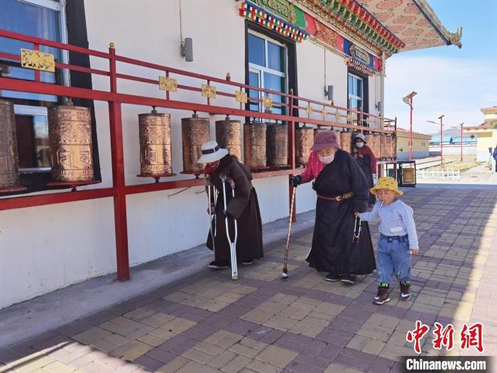 上午十點(diǎn),長(zhǎng)江源頭的青海玉樹治多縣幸福敬老院內(nèi),陽(yáng)光靜靜普照小廣場(chǎng),金色轉(zhuǎn)經(jīng)筒邊身著藏袍的老人彎腰拄拐,牽著吃糖的孩子悠悠踱步,遠(yuǎn)處皚皚雪山起伏。