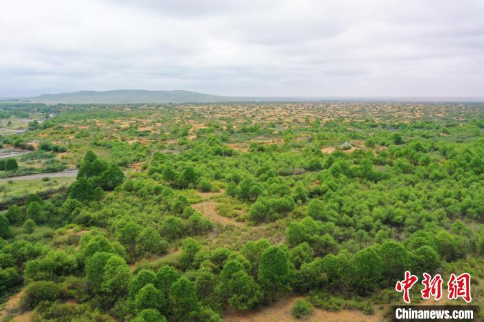 圖為航拍黃沙頭防沙治沙區(qū)植被。馬銘言 攝