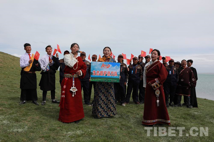 圖為扎陵湖畔青海牧民生態(tài)管護員方隊在歌唱 攝影:才仁當(dāng)智