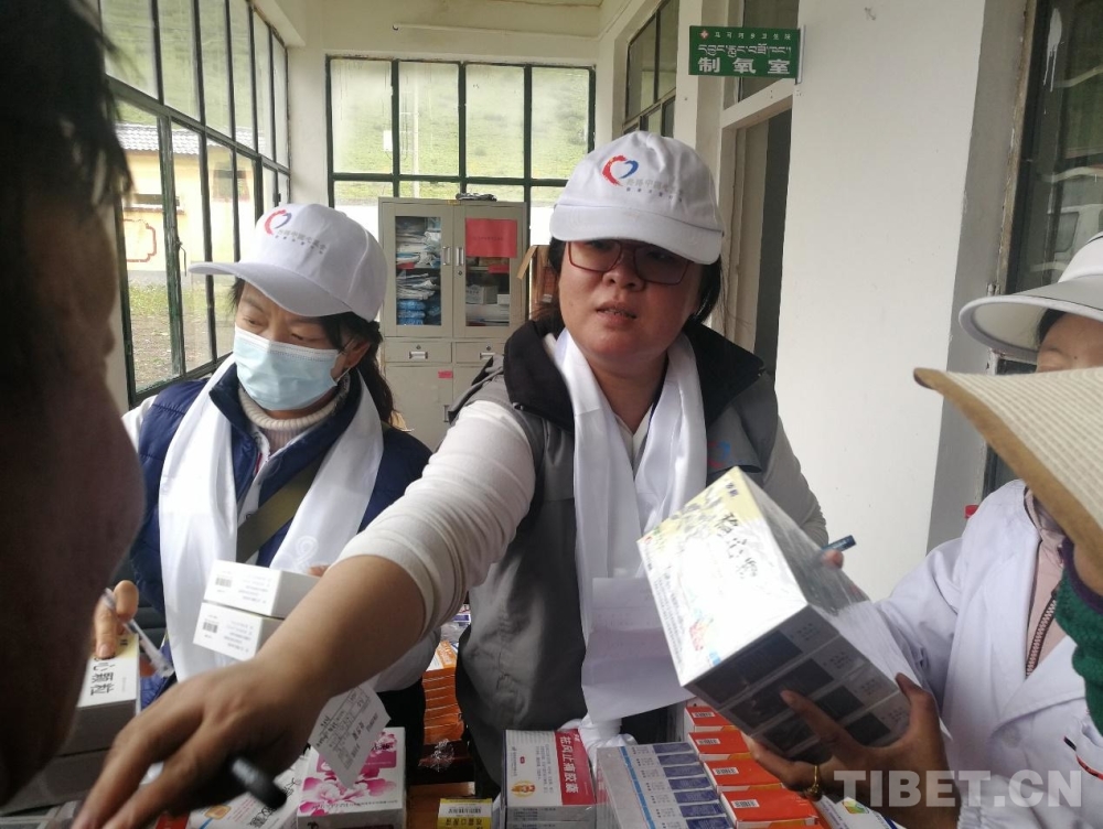 圖為陳思音(右)在果洛州義診時為當?shù)厝罕姺职l(fā)藥品