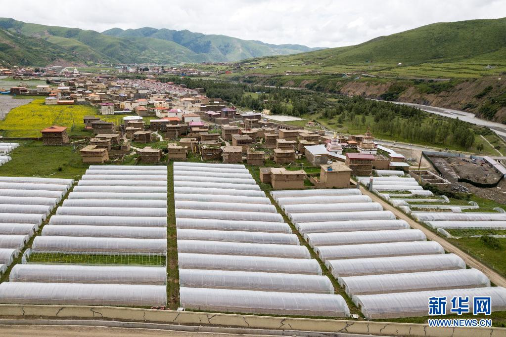 壤塘縣瑟谷村蔬菜基地內(nèi)的蔬菜大棚(7月17日攝,無人機(jī)照片)。新華社記者 李鑫 攝