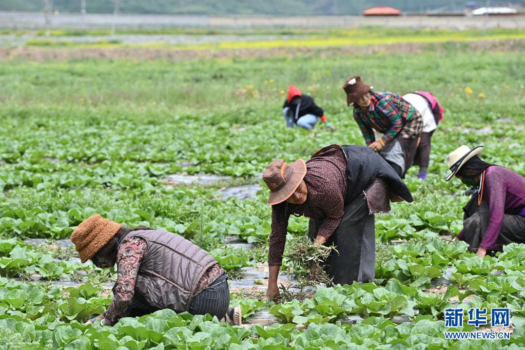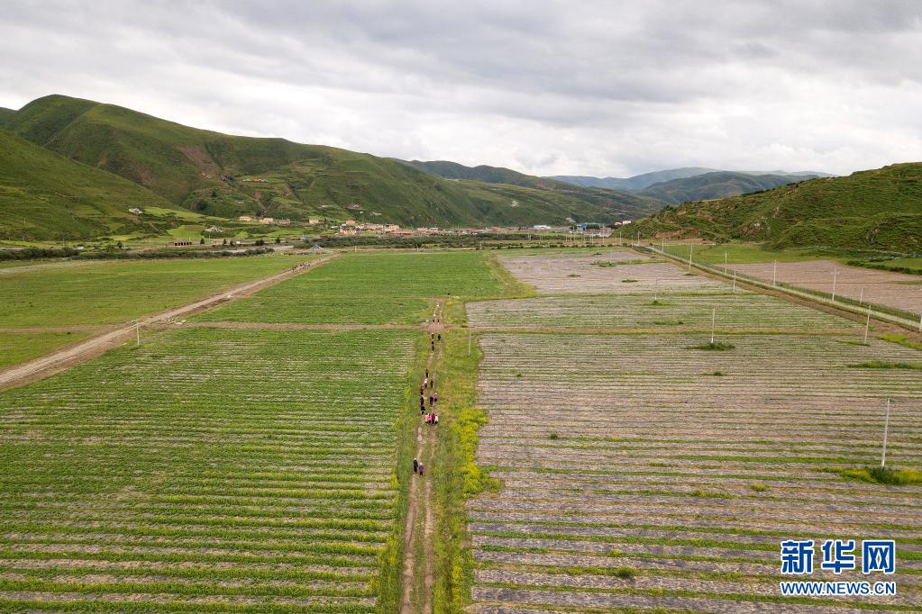 7月17日,壤塘縣瑟谷村農(nóng)牧民在蔬菜基地的菜地內(nèi)除草。新華社記者 李鑫 攝