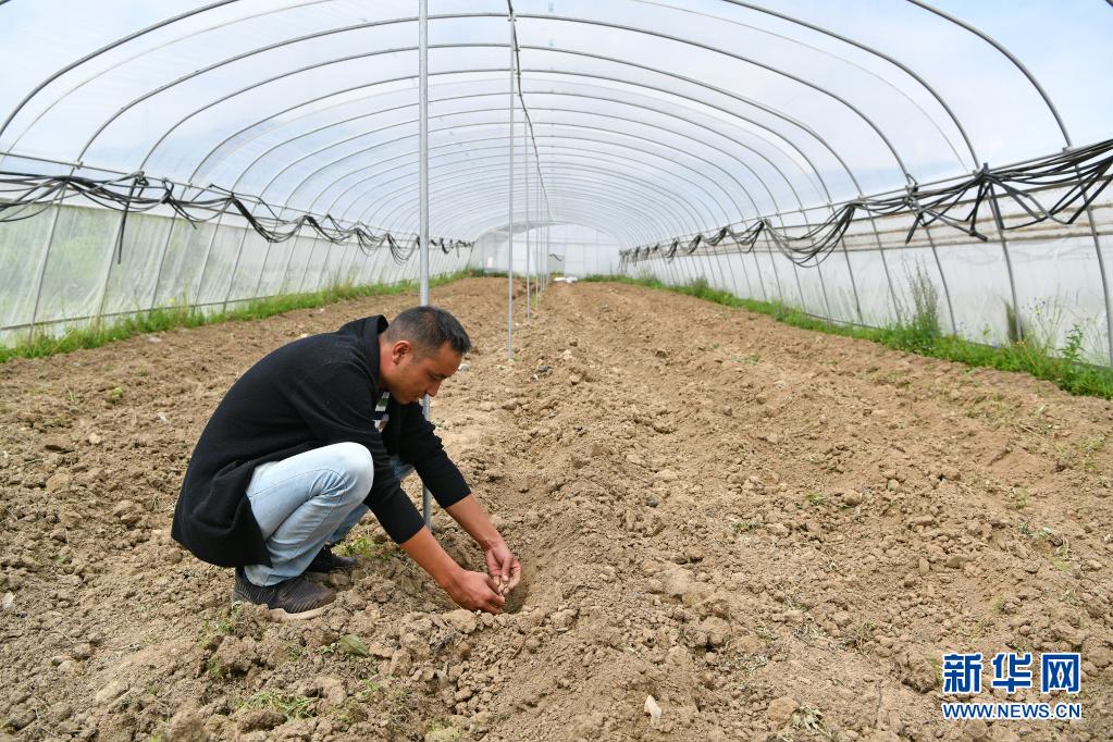 7月17日,壤塘縣瑟谷村蔬菜基地工作人員在大棚內(nèi)查看育種情況。新華社記者 李鑫 攝
