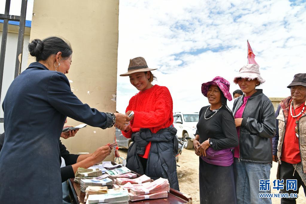 7月17日,壤塘縣瑟谷村農(nóng)牧民在領(lǐng)取務(wù)工收入。新華社記者 李鑫 攝