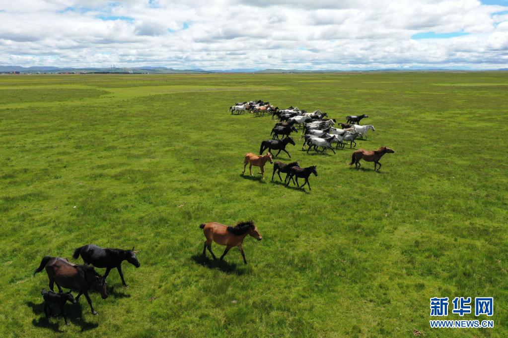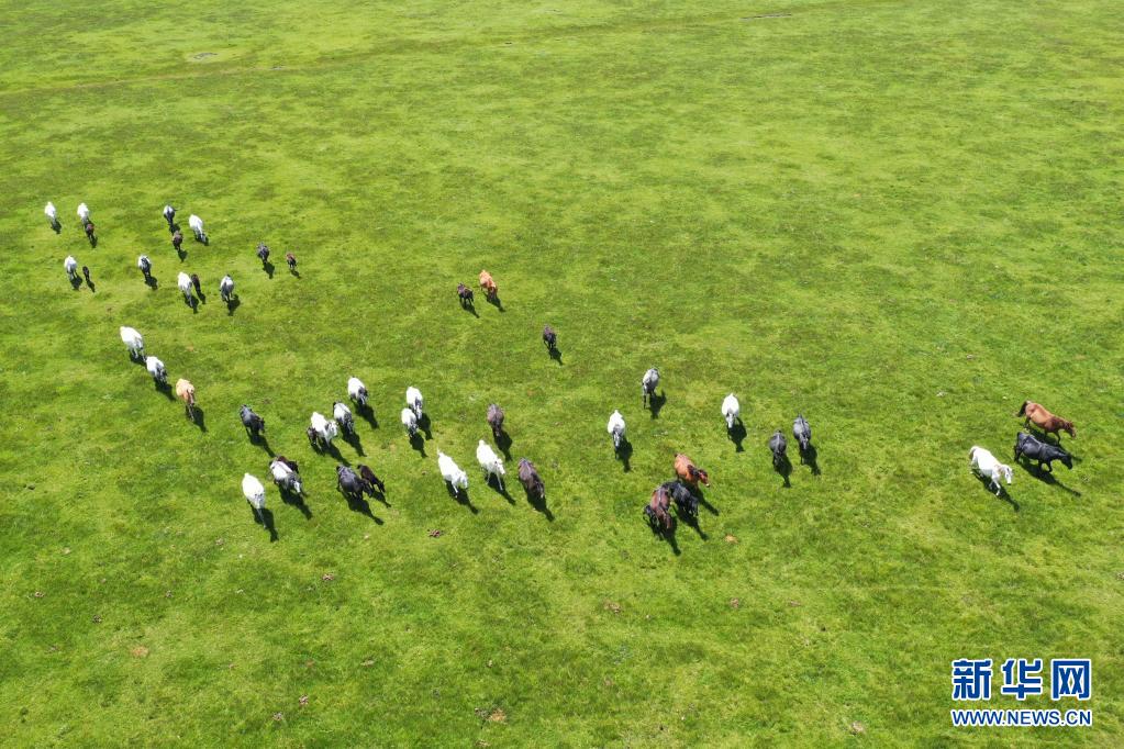 這是7月15日在甘肅瑪曲縣河曲馬場(chǎng)拍攝的河曲馬(無人機(jī)照片)。 新華社記者 杜哲宇 攝