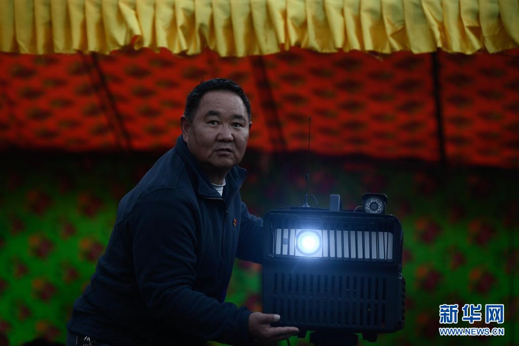 8月3日,在瑪沁縣當(dāng)洛鄉(xiāng)貢龍村的夏季草場(chǎng)上,南拉才讓為牧民放電影。新華社記者 張龍 攝