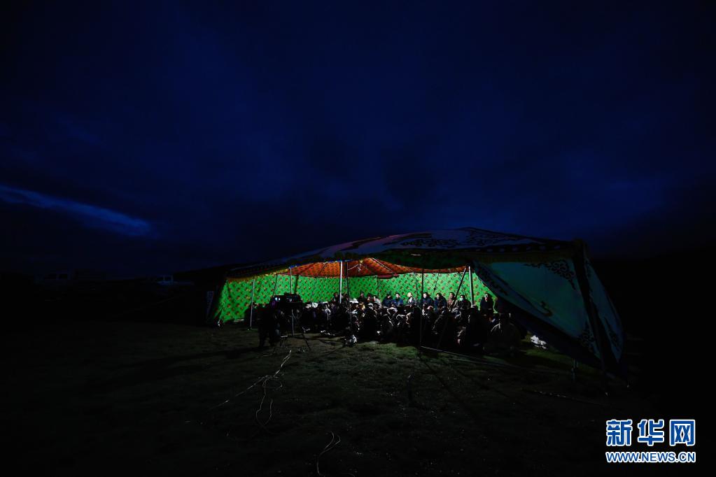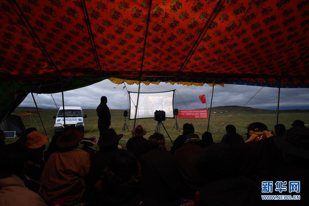 8月3日,在瑪沁縣當(dāng)洛鄉(xiāng)貢龍村的夏季草場(chǎng)上,牧民群眾在看電影。新華社記者 張龍 攝