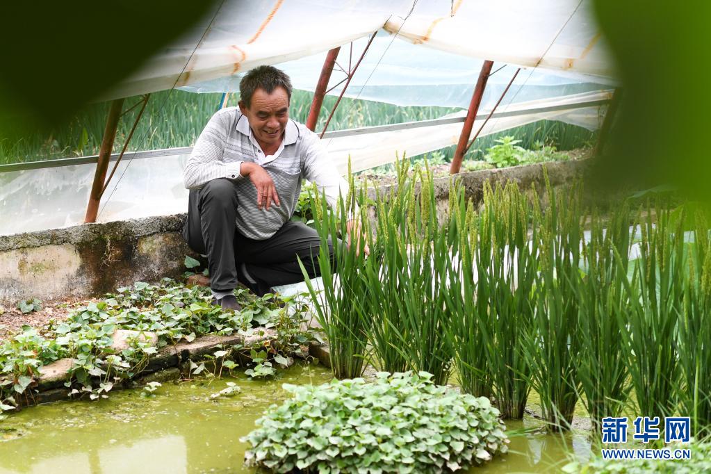 8月5日,魏金明在玉樹(shù)市結(jié)古鎮(zhèn)新寨村的蔬菜基地查看水稻長(zhǎng)勢(shì)。新華社記者 吳剛 攝