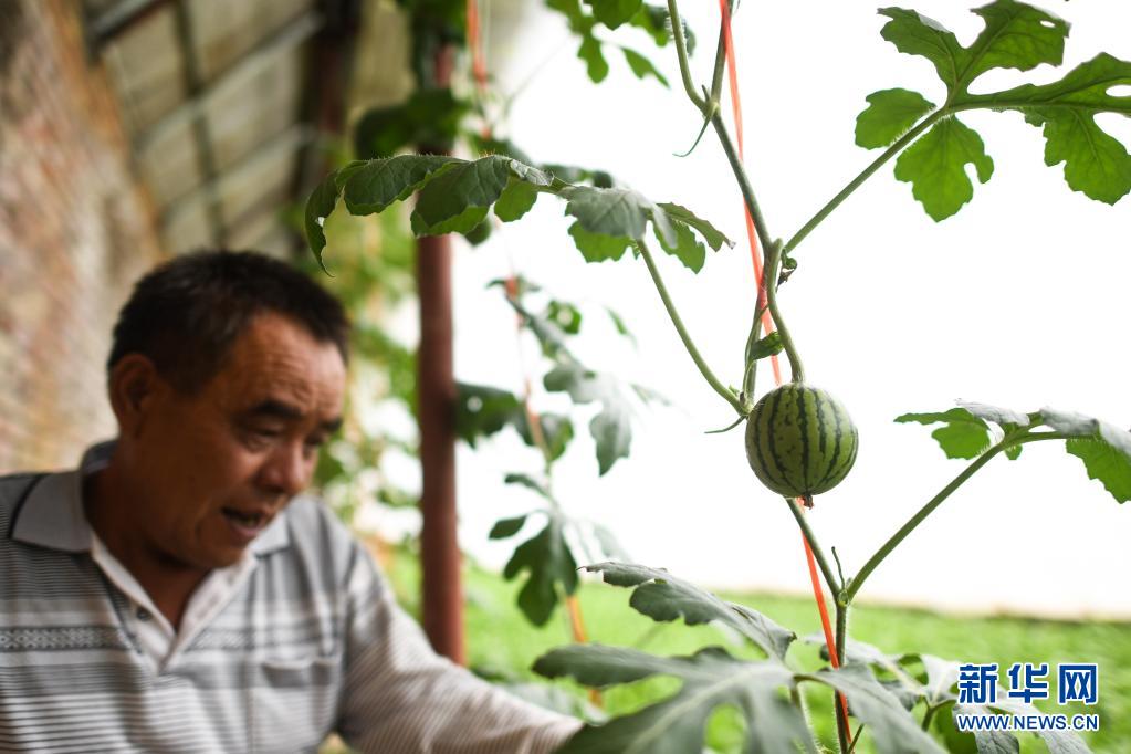 8月5日,魏金明在玉樹(shù)市結(jié)古鎮(zhèn)新寨村的蔬菜基地查看西瓜長(zhǎng)勢(shì)。新華社記者 吳剛 攝