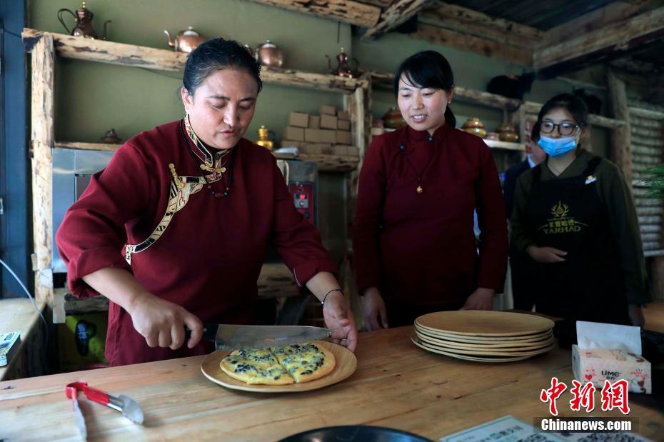 村民在為游客準(zhǔn)備“藏式披薩”。王磊 攝