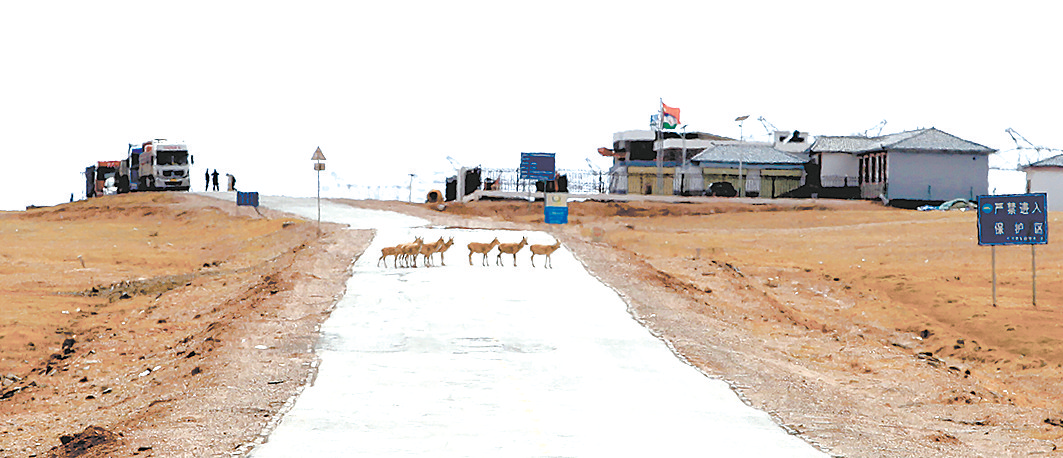母藏羚羊小心翼翼穿過青藏公路。