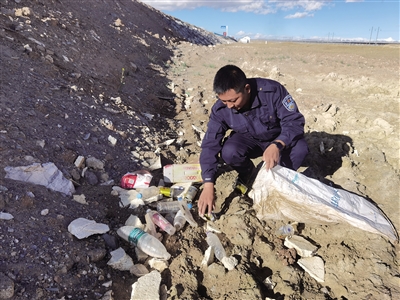 可可西里索南達(dá)杰保護(hù)站工作人員在109國道沿線撿拾被丟棄的垃圾。可可西里管理處供圖