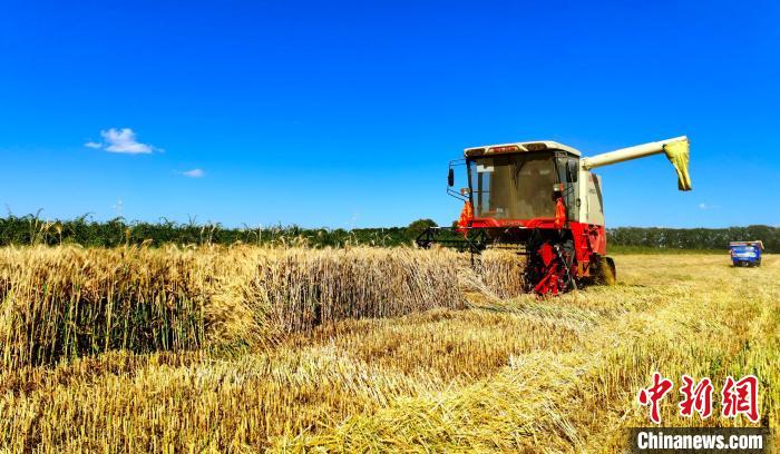 圖為收割機(jī)正在麥田收割。宗布爾 攝