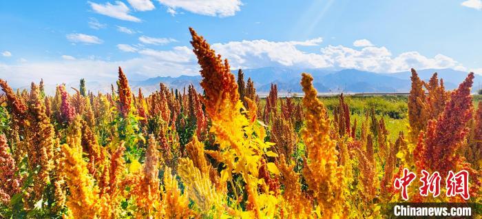 河西農(nóng)場農(nóng)民劉旦智種了30畝藜麥,紅色、白色、黑色的藜麥,在藍(lán)天白云的映襯下,勾勒出一幅高原秋收的美景圖?!敖衲贽见滈L勢不錯,一畝地大約600多斤,如果每斤按4塊錢算,一畝地可以收入3000多塊錢,經(jīng)濟(jì)效益很不錯。我還種了40多畝枸杞,長勢跟去年差不多,1斤能賣20多塊錢?!眲⒌┲歉吲d地給記者算著賬。