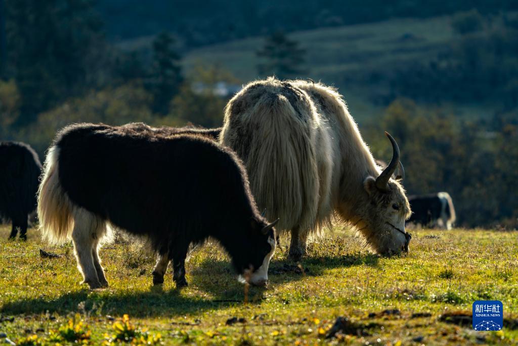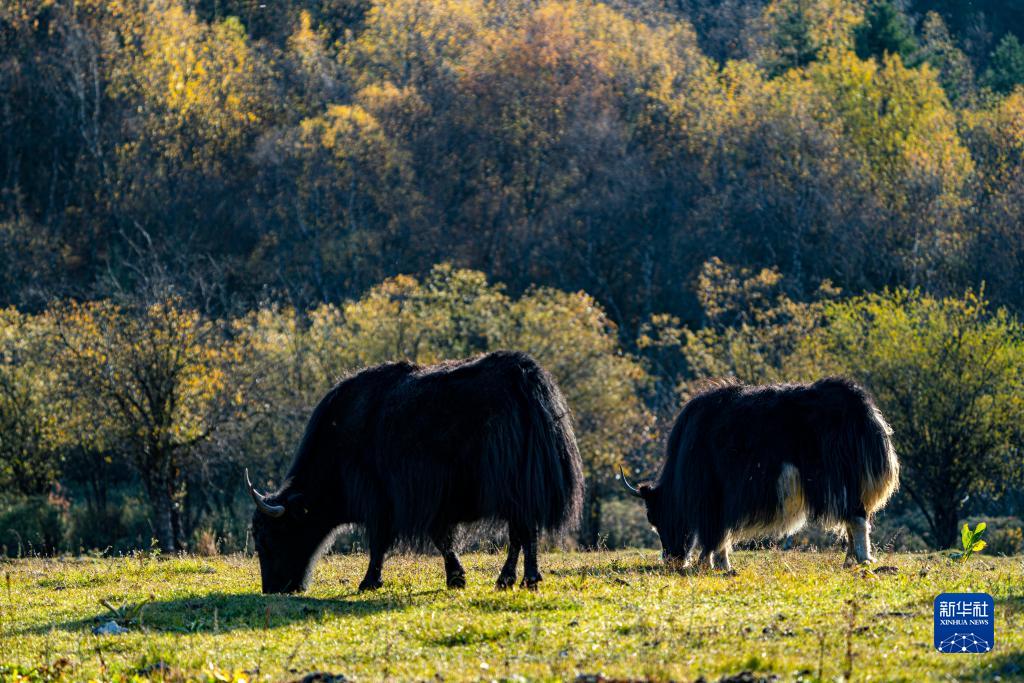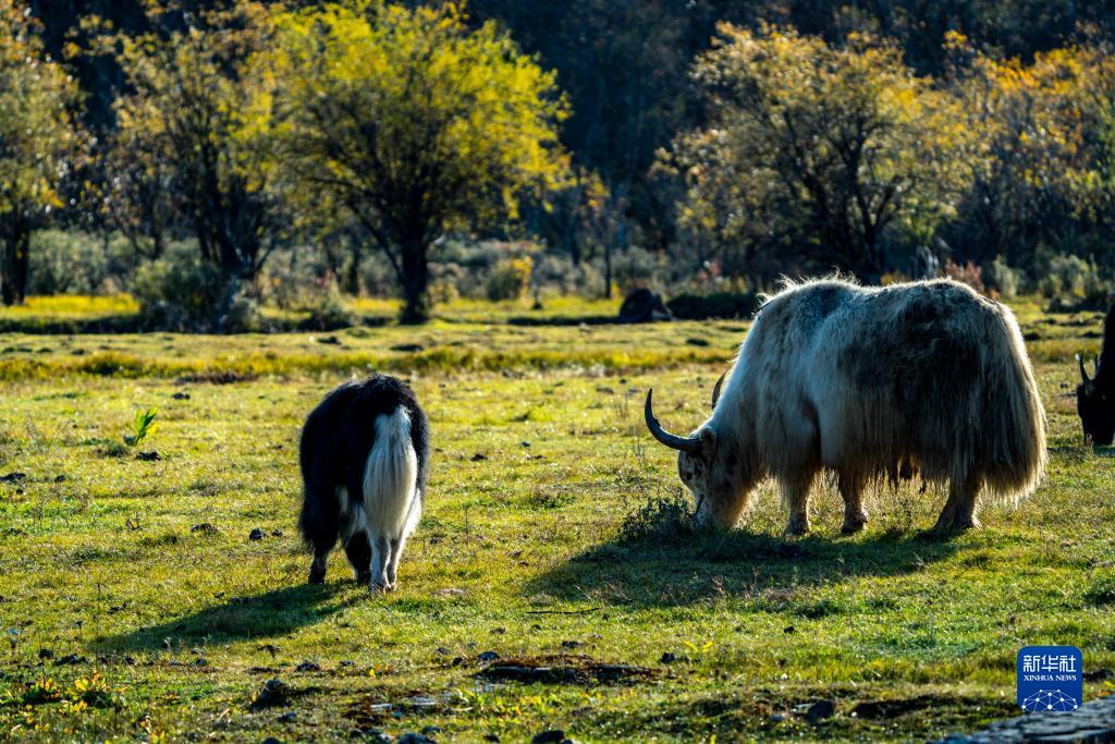 牦牛在普達(dá)措景區(qū)草場(chǎng)上覓食(10月25日攝)。新華社記者 江文耀 攝