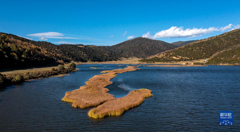 普達(dá)措景區(qū)屬都湖秋色(無(wú)人機(jī)照片,10月25日攝)。新華社記者 江文耀 攝