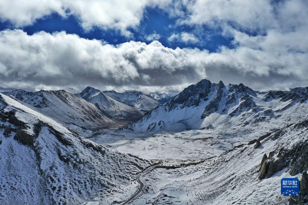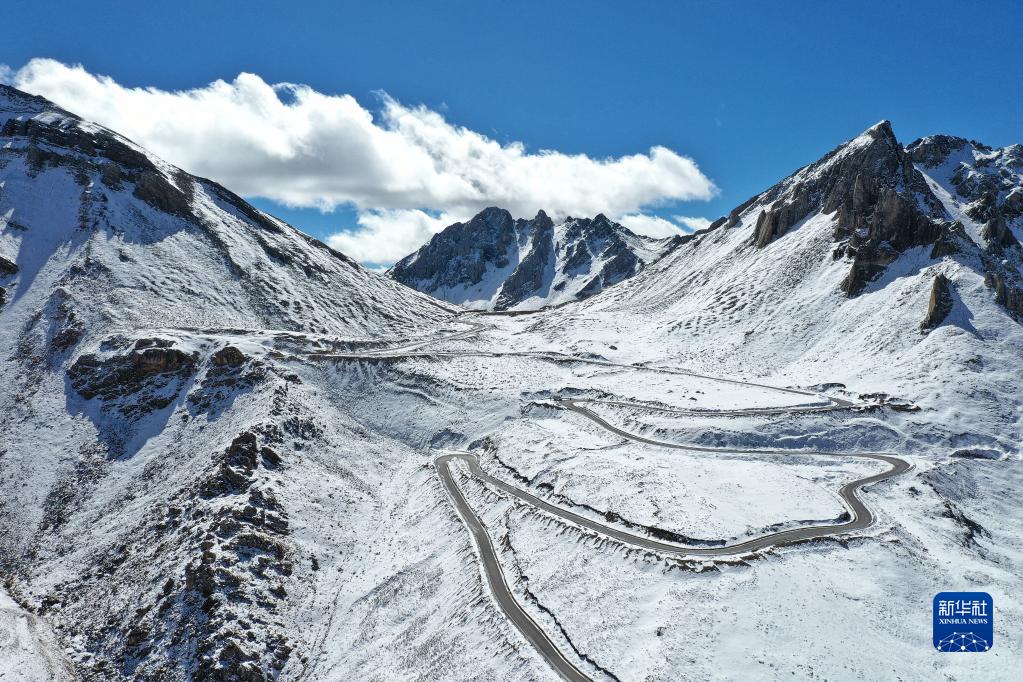 這是四川省甘孜藏族自治州巴塘縣境內(nèi)的通往藏巴拉雪山埡口的公路(10月23日攝,無(wú)人機(jī)照片)。新華社記者 劉坤 攝