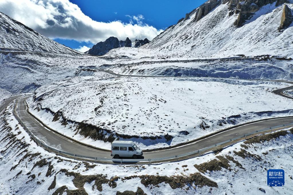 10月23日,一輛汽車行駛在四川省甘孜藏族自治州巴塘縣境內(nèi)的藏巴拉雪山的公路上(無(wú)人機(jī)照片)。新華社記者 劉坤 攝