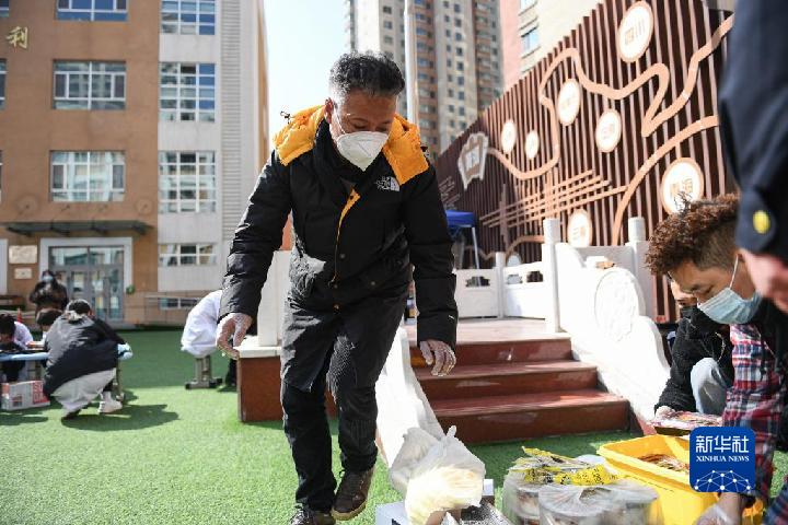 10月31日,羅宗周正在為西寧勝利路一社區(qū)核酸采樣點(diǎn)送愛心餐。新華社記者 吳剛 攝