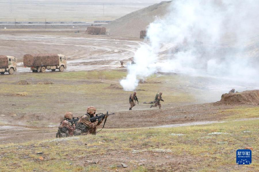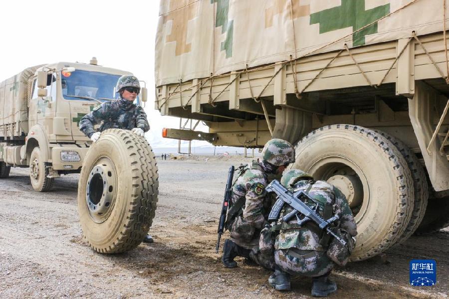 聯(lián)勤保障部隊(duì)汽車(chē)運(yùn)輸某團(tuán)一營(yíng)一連參加高原駐訓(xùn)時(shí),在行車(chē)途中組織官兵進(jìn)行防衛(wèi)演練(2020年6月16日攝)。新華社發(fā)