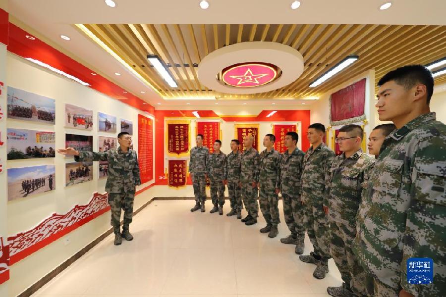 聯(lián)勤保障部隊(duì)汽車(chē)運(yùn)輸某團(tuán)一營(yíng)一連連長(zhǎng)孟凡龍(左一)為新兵講述連隊(duì)歷史(7月11日攝)。新華社發(fā)