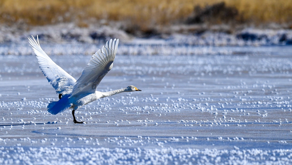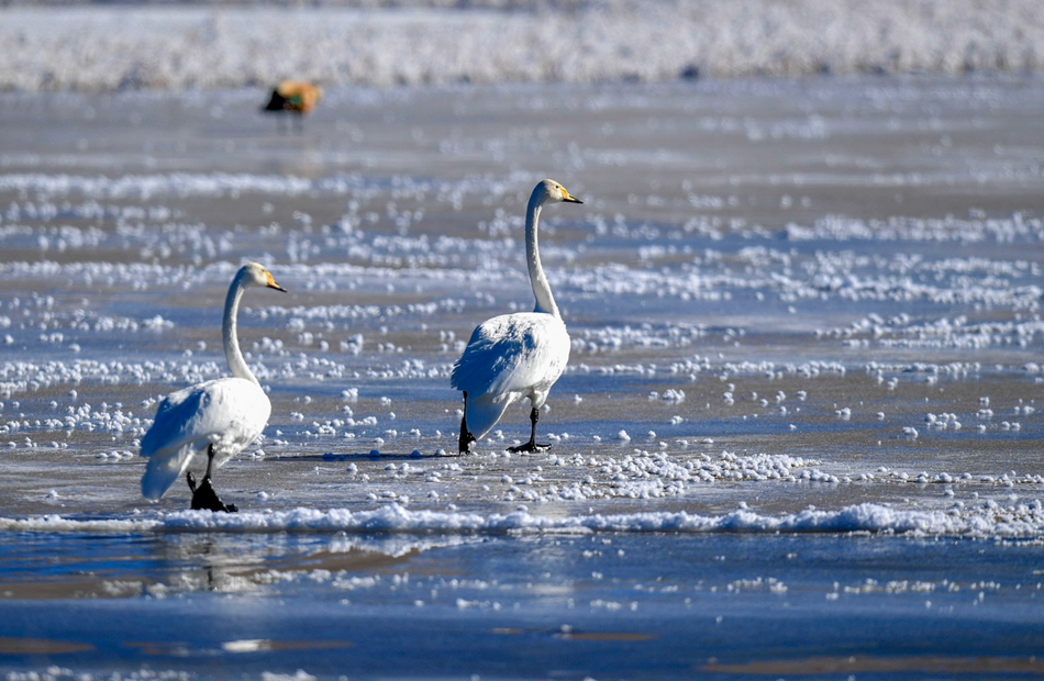入冬以來,甘肅省甘南藏族自治州碌曲縣尕海濕地越冬的大天鵝浴雪歡歌,翩翩起舞,成為草原上一道獨(dú)特的風(fēng)景。