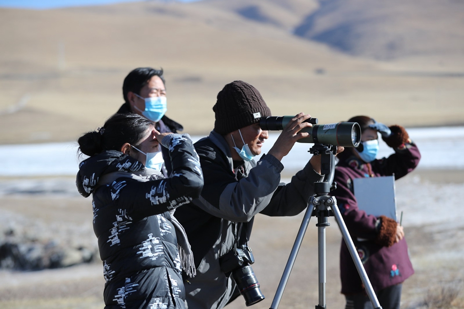 尕海保護(hù)站工作人員實(shí)地開展鳥類監(jiān)測調(diào)查。