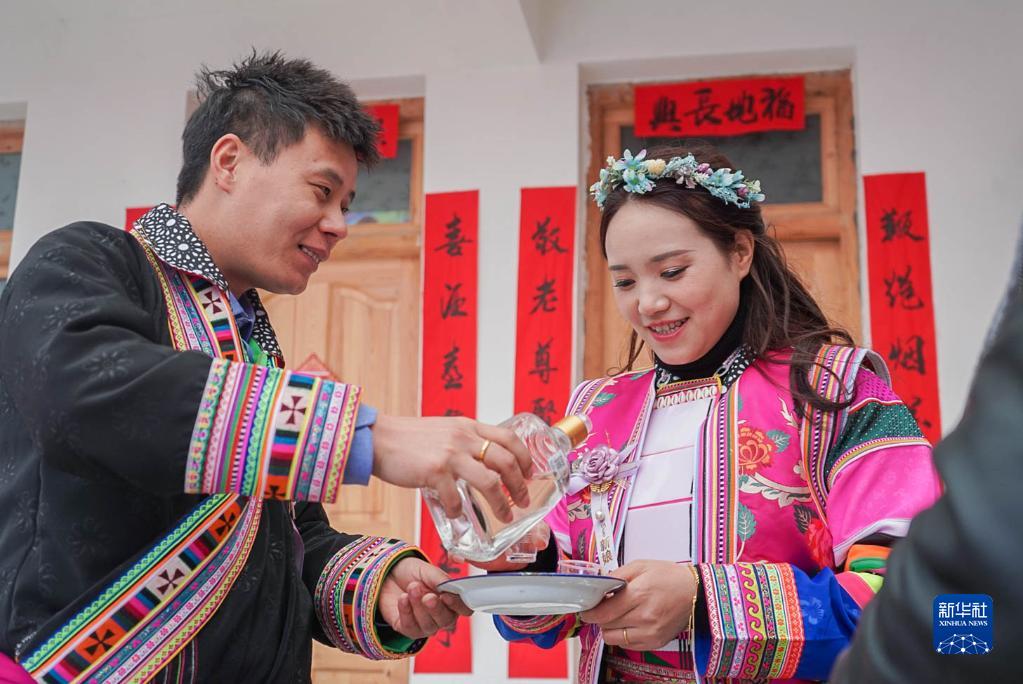 1月13日,在隴南市文縣鐵樓藏族鄉(xiāng)寨科橋村的白馬藏族婚禮上,新娘和新郎準(zhǔn)備向賓客敬酒。新華社記者 郎兵兵 攝